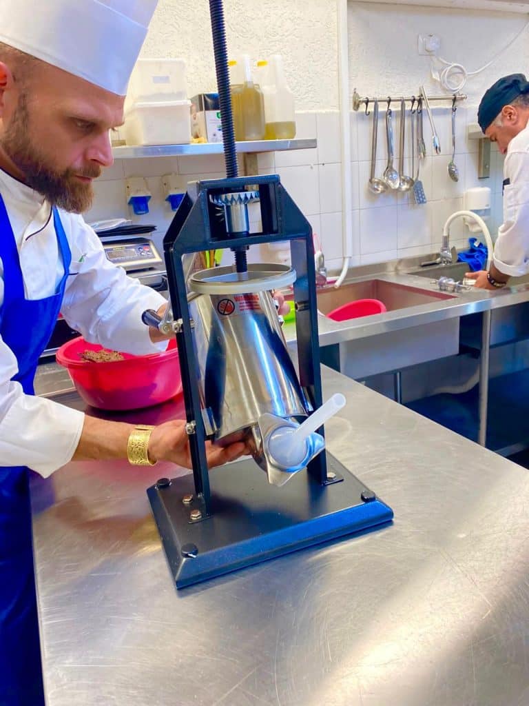 הכנת המסה: טוחנים את כל סוגי הבשר, השומן, הריאות ושיני השום במטחנת בשר.