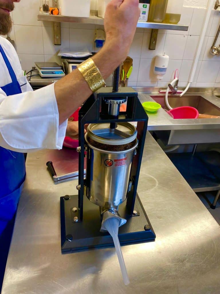 מילוי: ממלאים את המעיים בתערובת בדחיסה וקולעים לנקניקיות באורך הרצוי.